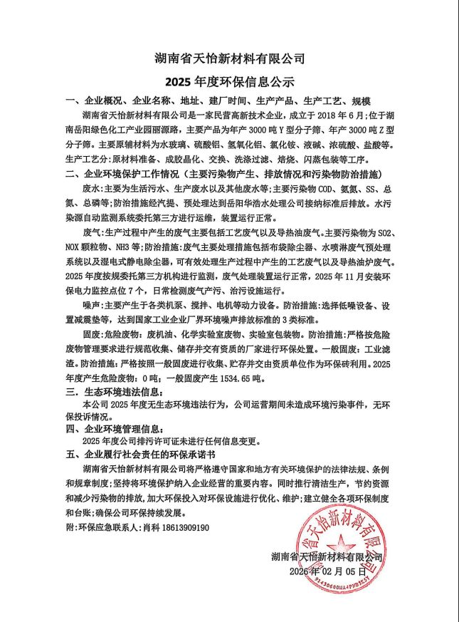 湖南省天怡新材料有限公司2025年度环保信息公示